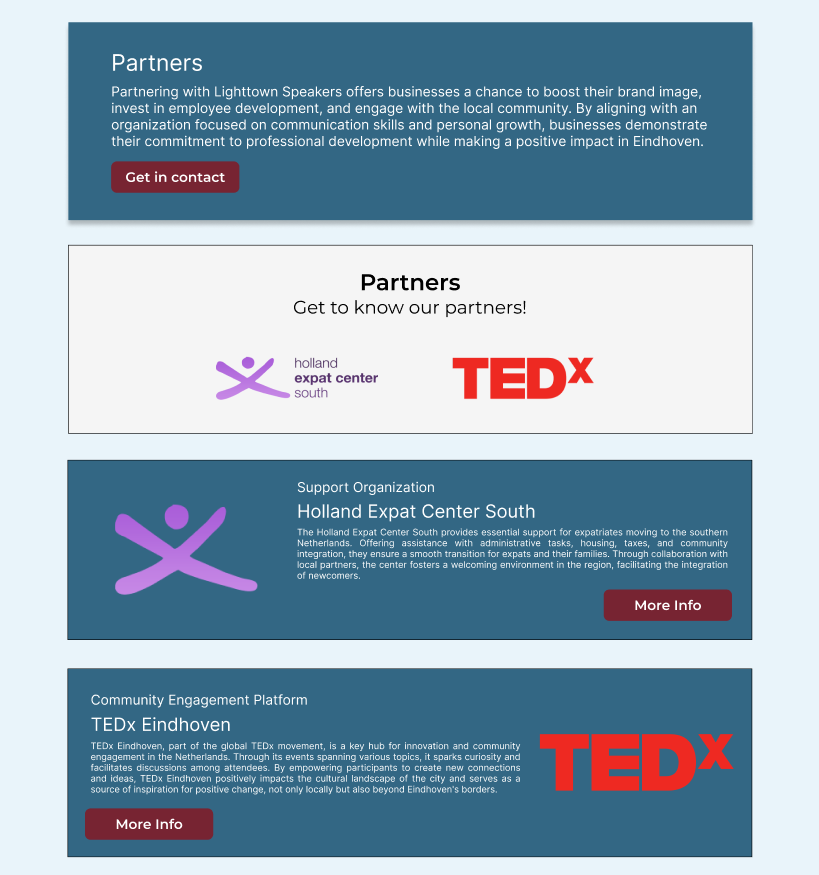 For four weeks, I was able to focus on the website and code every page that I had created in Figma prototype. The project was a two-person project, therefore there was a lot of content to create. I began with the partners and about us pages. I had some reservations about the partners page because I didn't like how the design turned out the first time I created it, so I decided to redesign the page in Figma and then code it.