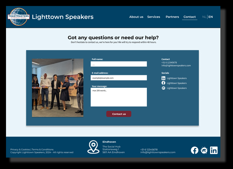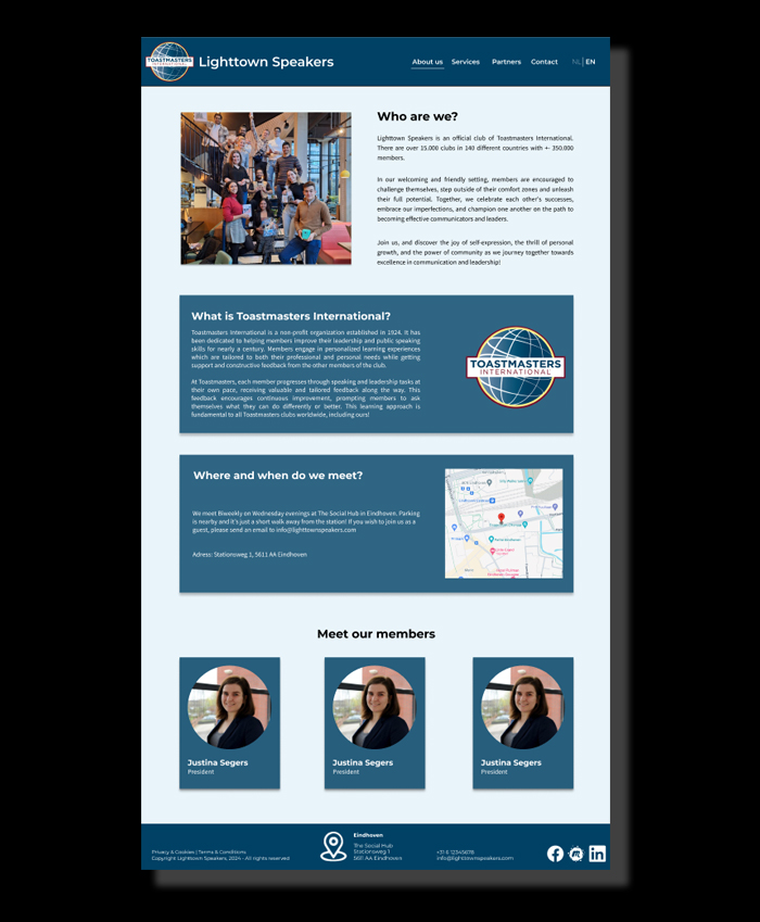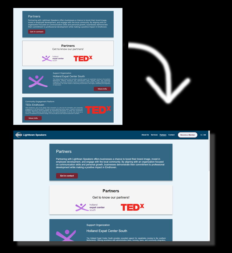 For four weeks, I was able to focus on the website and code every page that I had created in Figma prototype. The project was a two-person project, therefore there was a lot of content to create. I began with the partners and about us pages. I had some reservations about the partners page because I didn't like how the design turned out the first time I created it, so I decided to redesign the page in Figma and then code it.